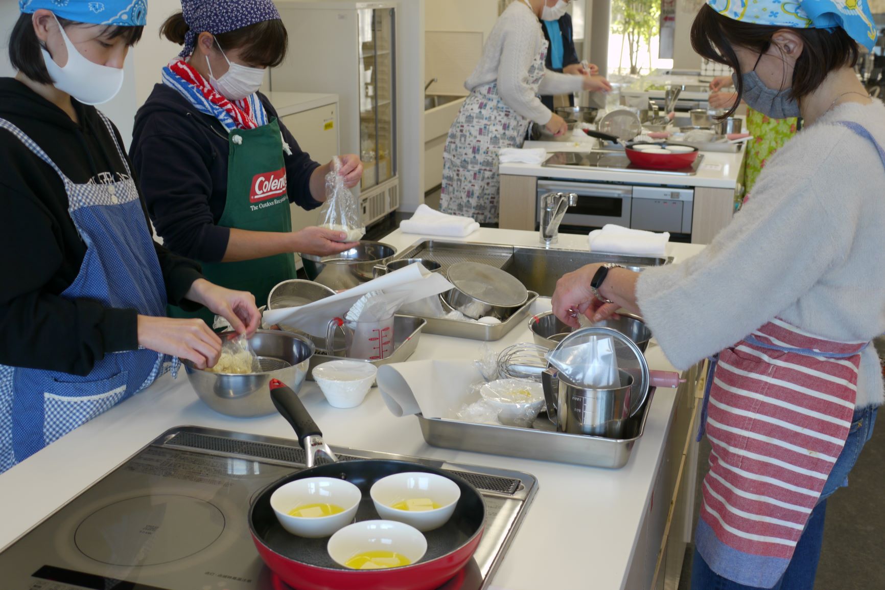 〇メロープラザ調理室では、焼き菓子のマドレーヌ作りを体験。